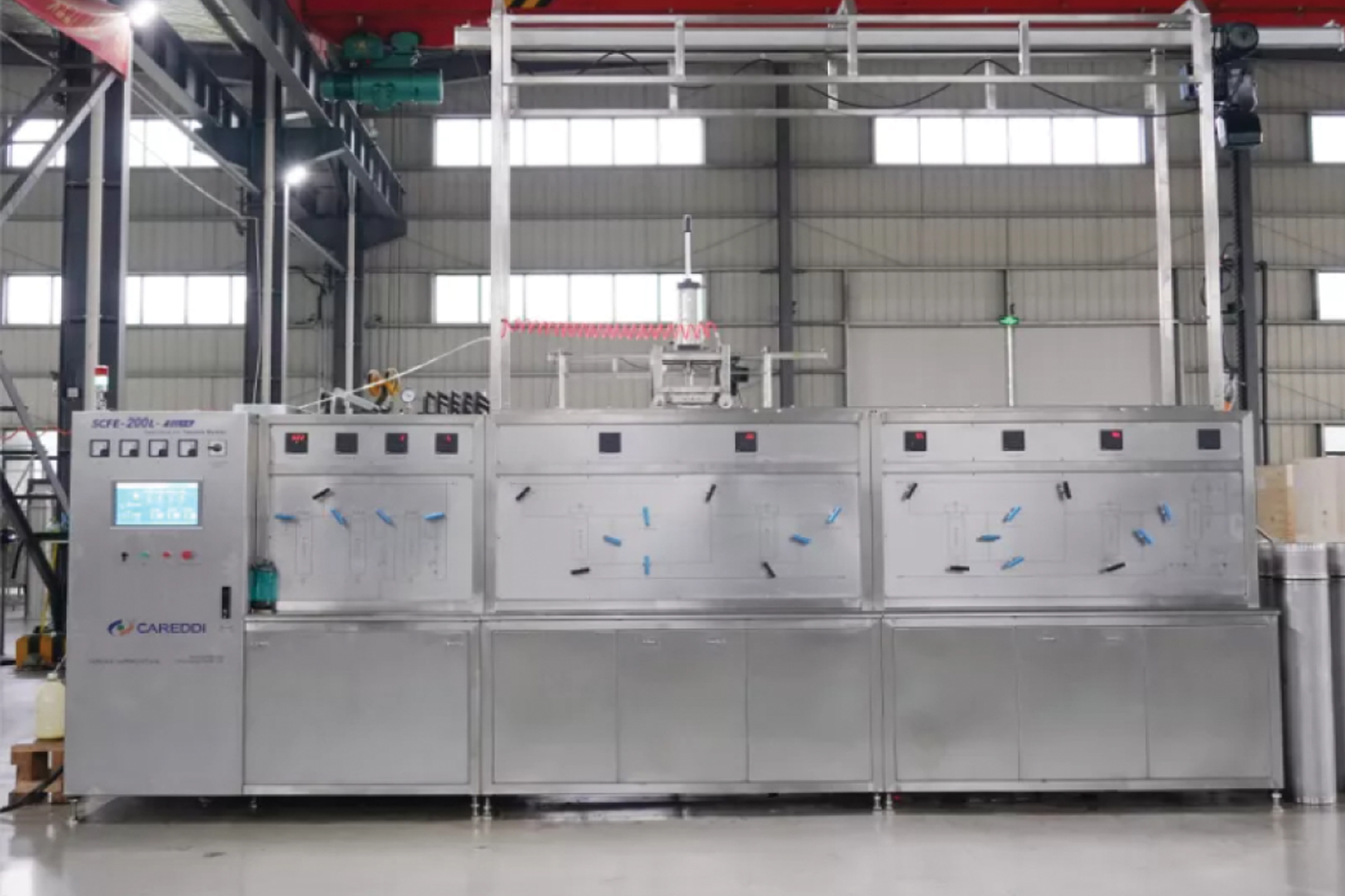 it is a commercial‑scale system engineered for medium‑to‑large production runs of botanical extracts, essential oils, or herbal actives. In a common configuration, this model comprises four extraction vessels of 50 L each (for total extraction capacity of 200 L), allowing for operation in parallel to maintain throughput while individual units are being loaded or cleaned. It is designed for high pressures (circa 35–40 MPa, i.e. ~350‑400 bar) and elevated but controlled temperatures up to about 80‑85 °C to ensure the CO₂ is in its supercritical state—maximizing solvating power while protecting heat-sensitive compounds. The system also includes multiple separator vessels to recover extracts and fractionate them (e.g., light / heavy fractions), as well as a co‑solvent pump for tailored extraction of more polar constituents. Key supporting systems include jacketed heating and cooling systems, a high‑pressure CO₂ pump (often triple‑plunger), precise flow and temperature control (±1 °C), safety interlocks, and control panels (manual/PLC). All wetted parts are generally stainless steel (304 or 316L), with provisions for CO₂ recovery/recirculation to reduce operating cost and environmental footprint.